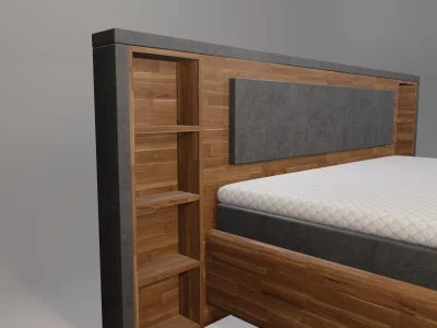 | Kopfteil: | Modell Stockholm 2 - Kopfteil aus Eiche Massivholz mit Regalen und umlaufenden Rahmen in Stoff |