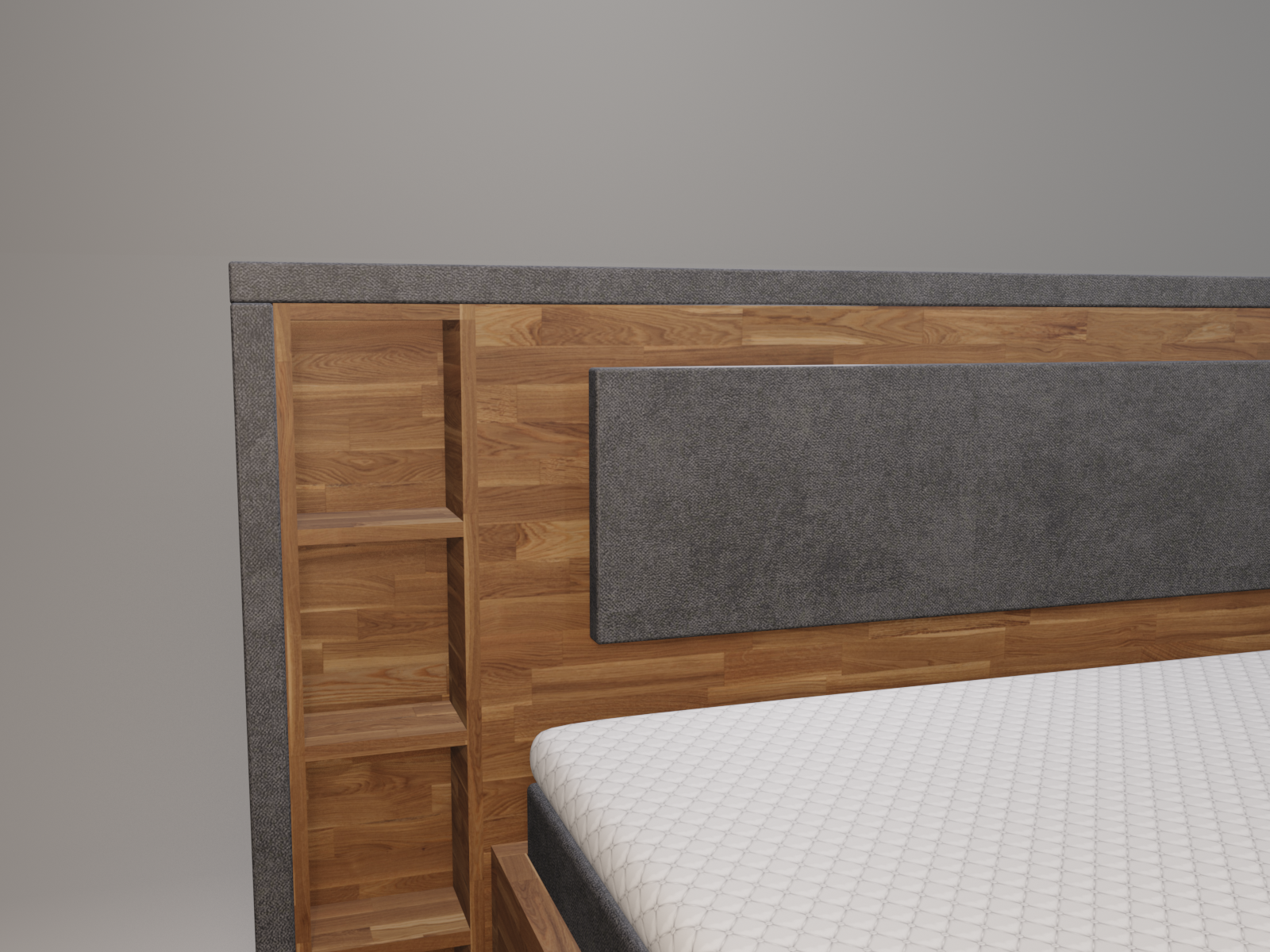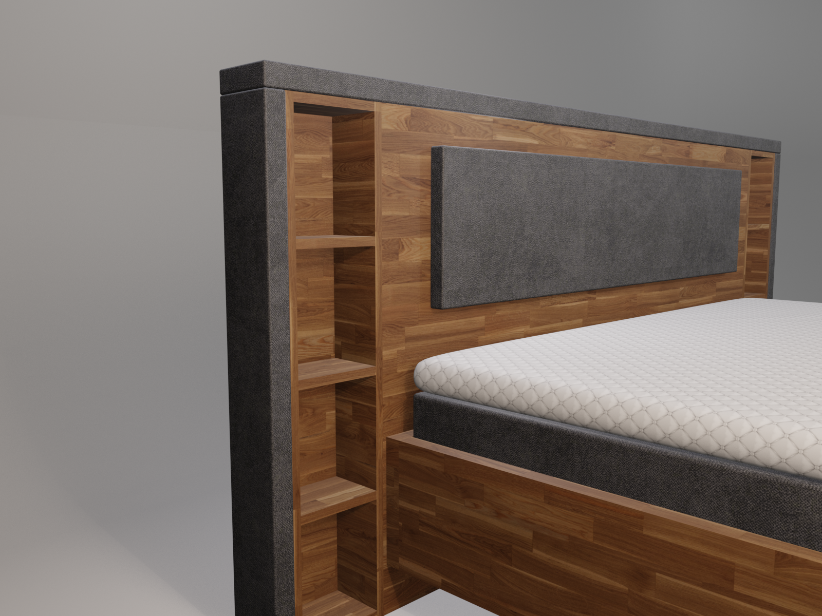 | Kopfteil | Modell Stockholm, umlaufender Stoffrahmen, Mittelteil aus Massivholz mit Regalelementen |