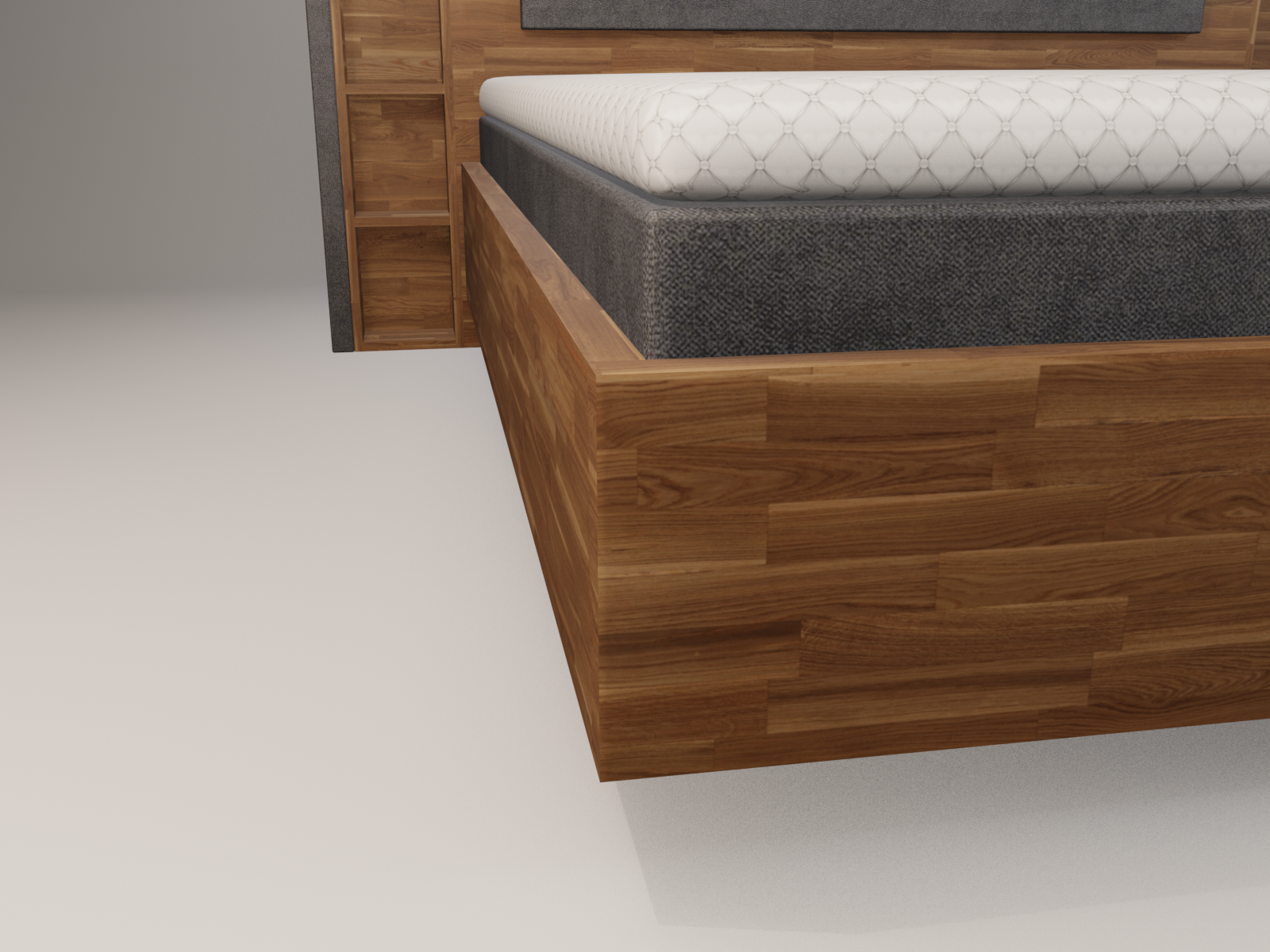 Der umlaufende Holzrahmen besteht aus 4 cm massivem Echtholz. Zusammen mit dem 30 cm hohen Bettrahmen entsteht ein beeindruckend stabiles, langlebiges und optisch ruhiges Gesamtbild.