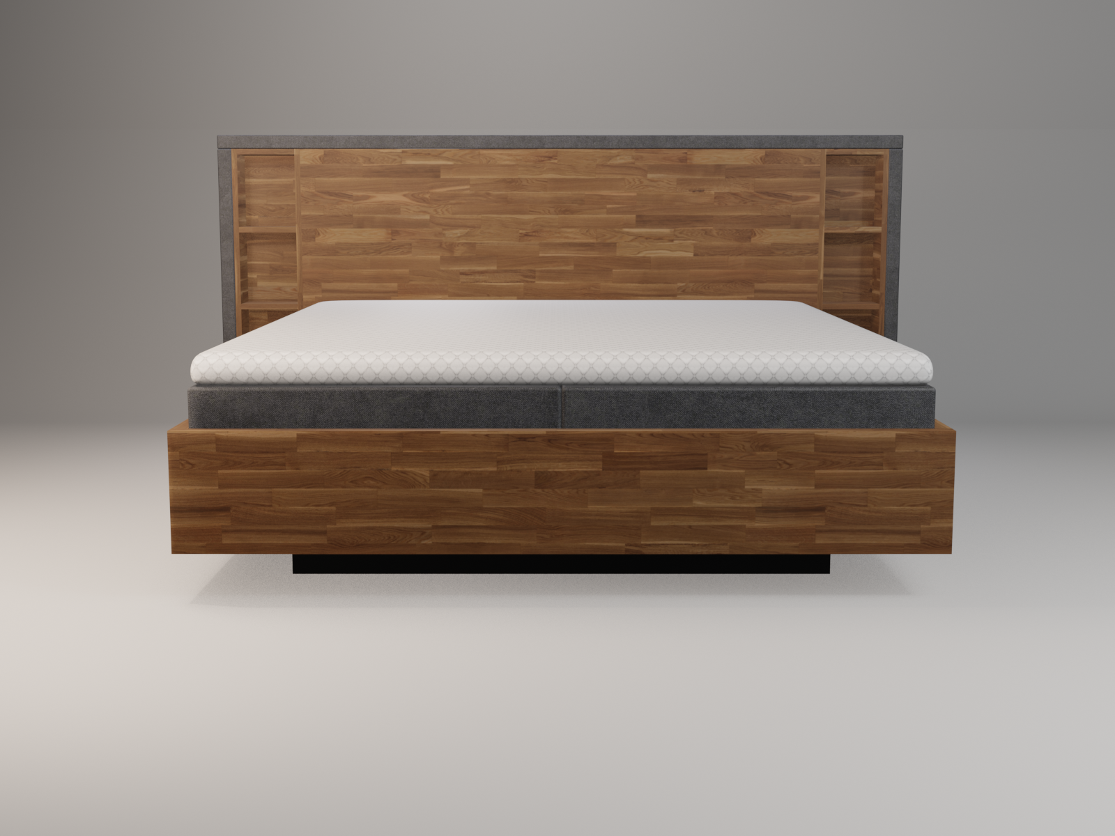 Das Boxspringbett Stockholm – Bergen Plus kombiniert massives Echtholz mit einem funktionalen Kopfteil inklusive seitlicher Regalfächer. Der zurückgesetzte Sockel erzeugt eine moderne Schwebeoptik, während Mini-Tonnentaschenfederkern, Premium-Matratzen und wählbare Topper höchsten Schlafkomfort bieten. Individuell konfigurierbar – mit 100 Tagen Matratzen-Umtauschgarantie.