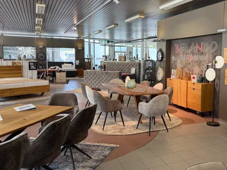 Ergänzt wird das Sortiment durch eine stilvolle Auswahl an Esstischen, Stühlen und Wohnmöbeln – abgestimmt auf ein harmonisches Wohn- und Schlafzimmerambiente.