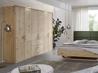 Der Kleiderschrank Lugano aus massiver Zirbe ist die Ergänzung zum Massivholzbett Lugano. In der unbehandelten Oberfläche können die ätherischen Öle ungehindert in den Raum ausstrahlen und das Raumklima verbessern.